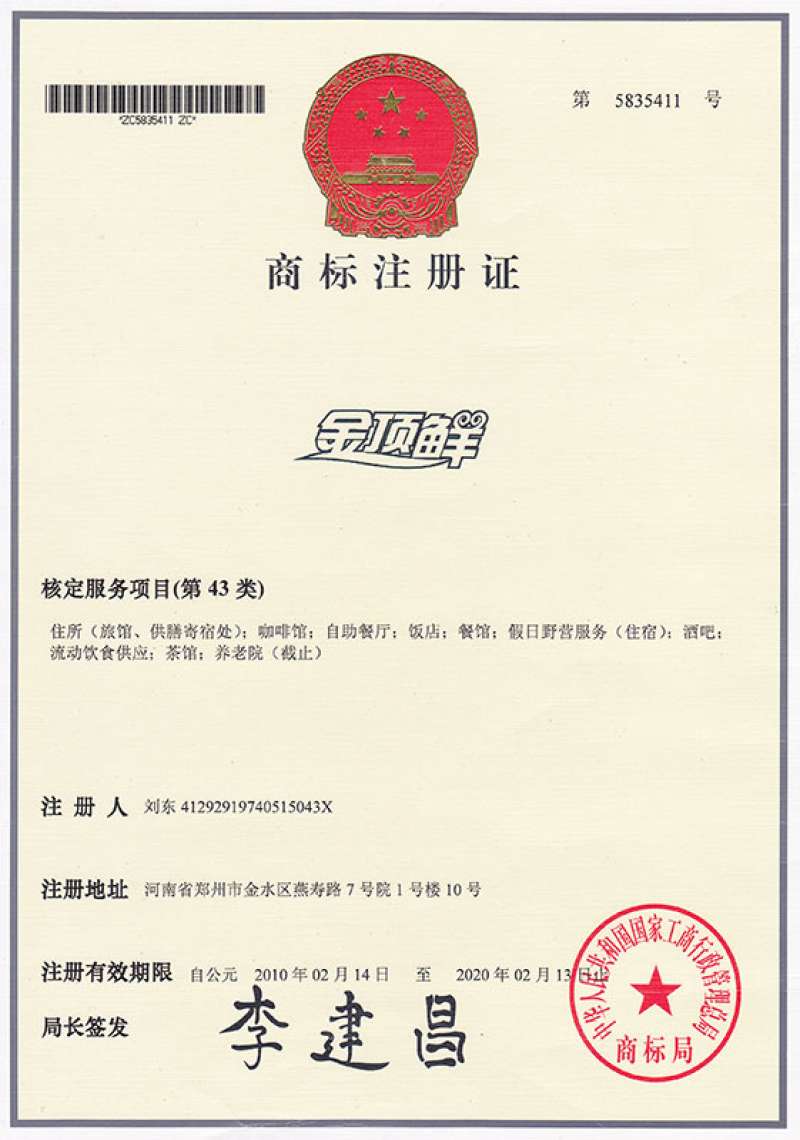 2002年穆香存女士为把事业做大做强,把精心研发的项目推向市场,决定走连锁加盟发展道路,让有能力的人、热爱餐饮行业的人来运作。2003年元月份起,金顶鲜宁夏系列特色项目在河南先推广开来,2006年改组成立股份制企业,注册“金顶鲜”系列商标,2010年2月14日公司拿到商标证(早期注册需用时3年左右,现在效率高,从注册日期算起,大概两年下来商标大证)。公司在随后经营发展的几年,又陆续花巨资注册/并购50多个商标来保护自主品牌。“胡羊排“就是典型代表,2013年8月份向国家商标局递交申请,2015年12月21日“胡羊排”商标成功注册。目前遍及河南、河北、山西、山东、安徽、浙江、江苏、陕西、广西、东北、甘肃、江西、四川、新疆等省份,已拥有500余家加盟分店。